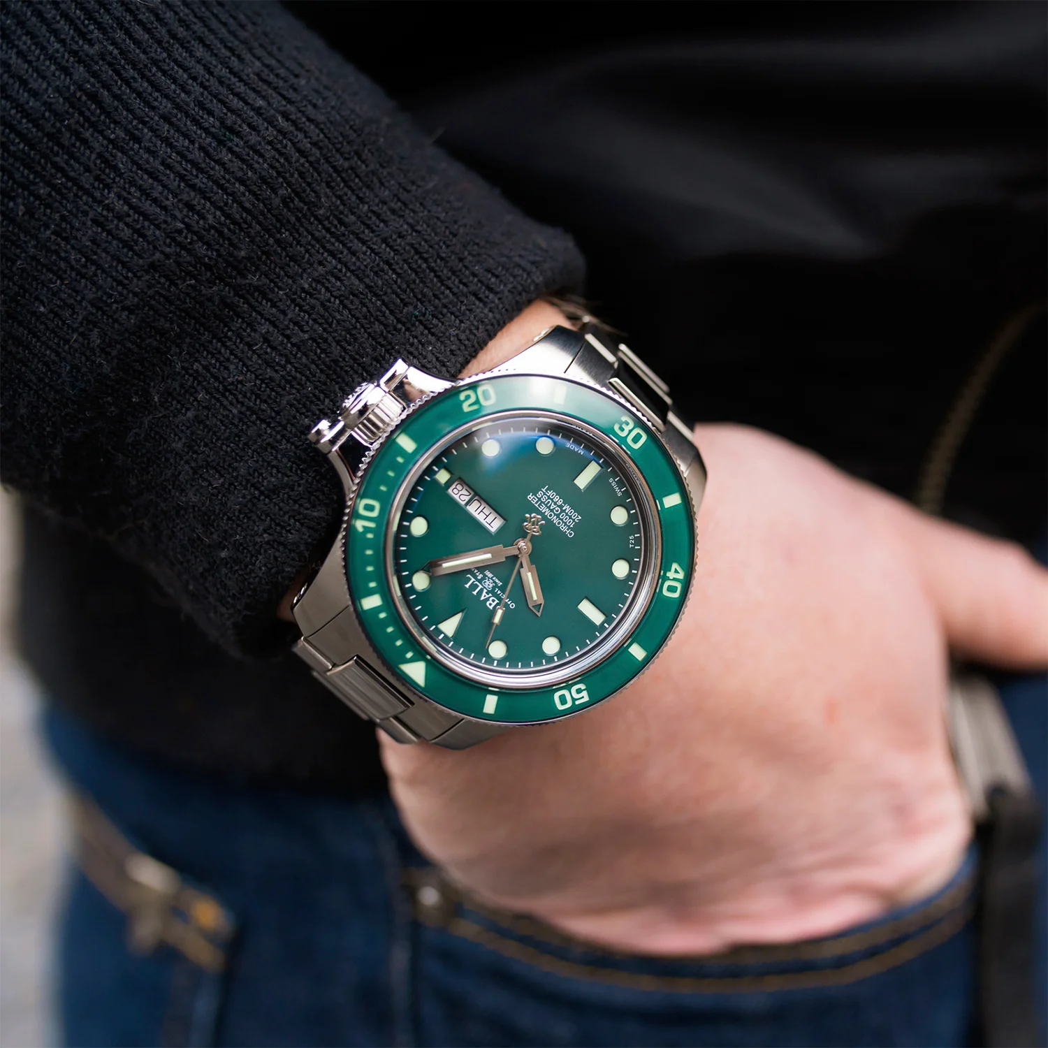 Constructed from stainless steel with a Mu-metal shield, the 43mm case is anti-magnetic up to 80,000 A/m. The patented crown protection system ensures its robustness, while the anti-reflective convex sapphire crystal enhances visibility. With a green dial, the watch is both stylish and functional. The tapered stainless steel bracelet, featuring a patented folding buckle and extension system, adds to its versatility. Weighing approximately 200g, the Engineer Hydrocarbon Original is a technical marvel, meeting the demands of exploration with a unique blend of style, precision, and virtual indestructibility. Whether in extreme conditions or everyday wear, this timepiece stands as a testament to BALL's commitment to toughness and reliability.