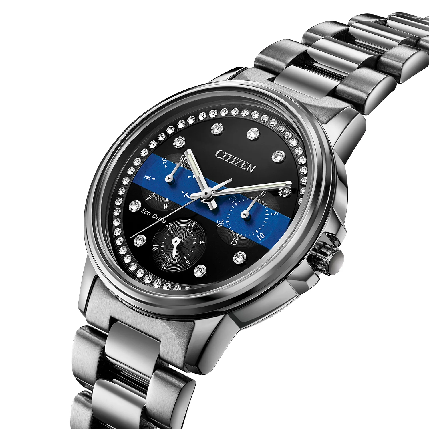 The Citizen Ladies Thin Blue Line™ watch is not only a fashionable accessory adorned with Swarovski crystals but also a symbol of respect and gratitude towards law enforcement, combining practicality, durability, and personalization in a memorable timepiece.