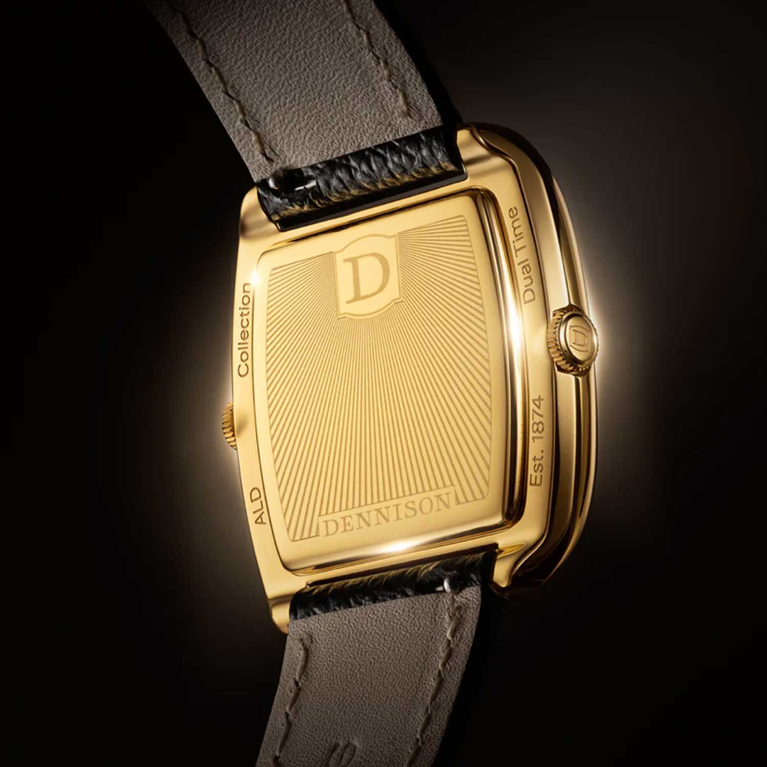 Dennison introduces the ALD Dual Time Lapis & Blue Sunray with Gold Tone Quartz, a timepiece designed for those who appreciate refined craftsmanship and expressive style. Built upon the design principles of the inaugural ALD Collection, this watch celebrates the enduring beauty of natural stone dials, showcased here in the bold, vibrant texture of Lapis Lazuli. Flecked with golden inclusions and paired with a recessed blue sunray subdial at 3 o’clock, the dial offers a captivating blend of artistry and precision while elegantly displaying a second time zone. Housed in a gold-tone stainless-steel case and powered by dual Swiss Quartz Ronda Cal. 1032 movements, it delivers both reliability and sophistication. At just 6.1 mm thick, the watch features a sapphire crystal, 30m water resistance, and a luxurious blue Epsom leather strap, creating a harmonious balance of comfort and presence.