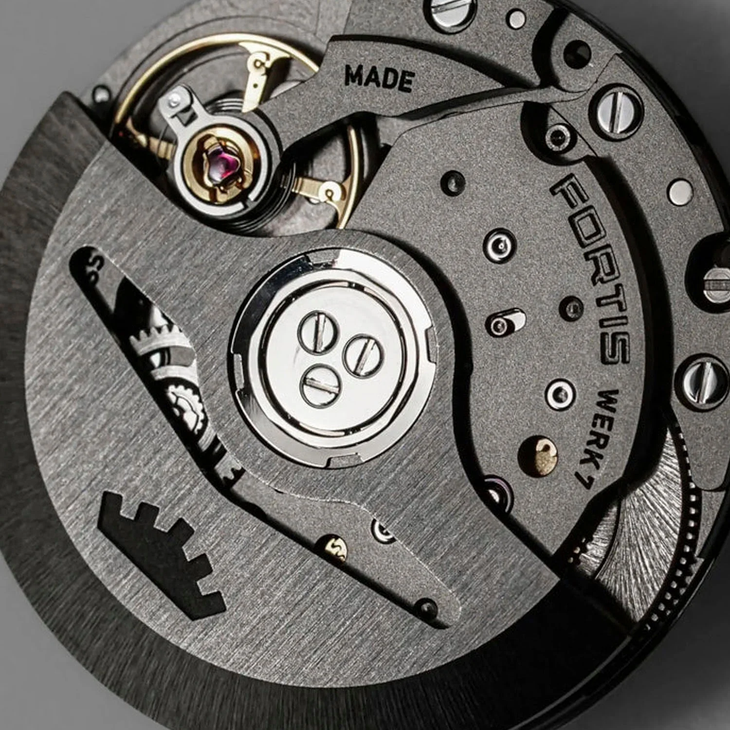 The hybrid strap combines high-performance FKM rubber on the inside for comfort and a robust textile exterior for durability, secured with a black DLC-coated stainless steel pin buckle. From its double fixation regulation system to its screw-down crown with triple gasket protection, every detail speaks to Fortis’ commitment to excellence. This isn’t just a watch—it’s pure pilot power on your wrist.