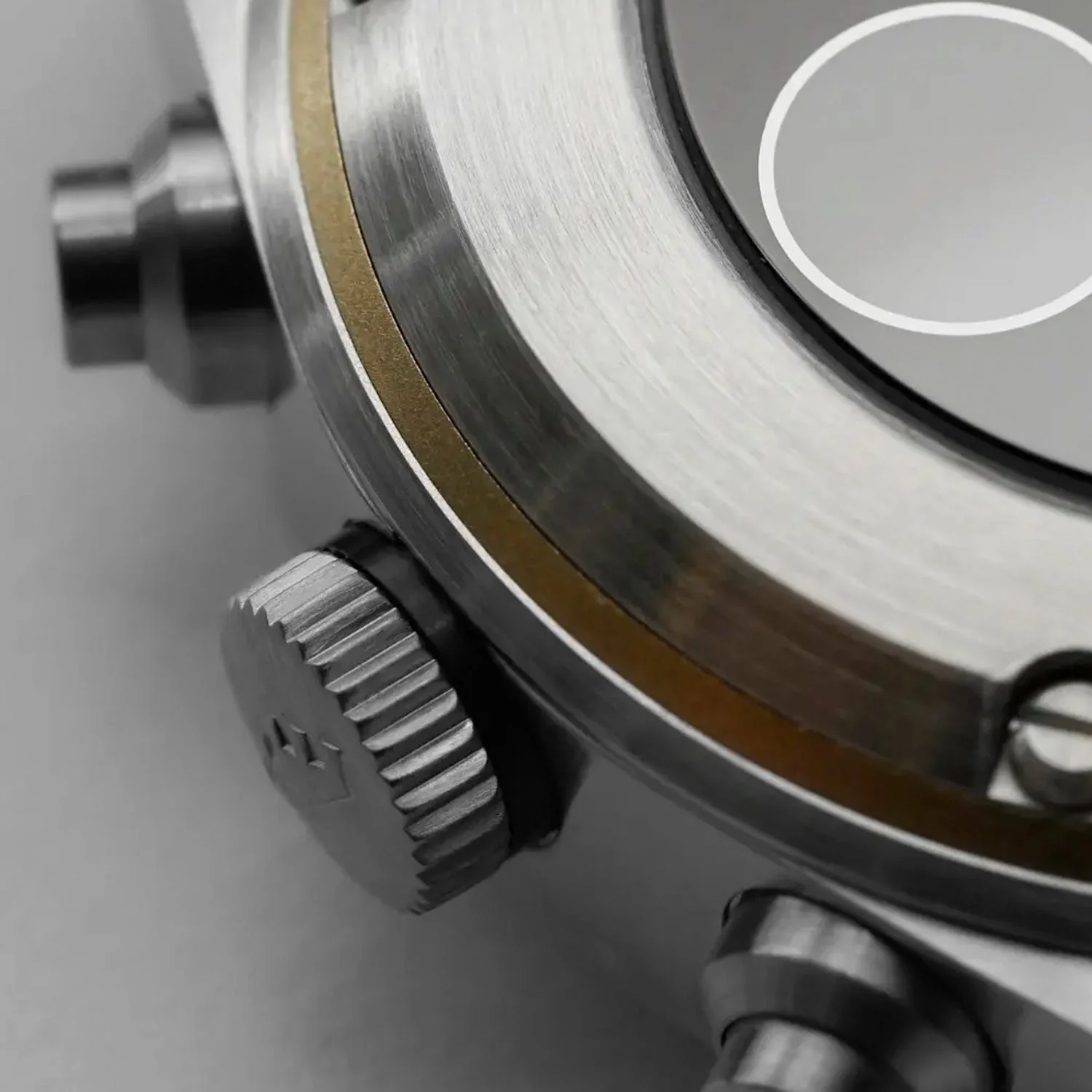 The cosmic gray stardust dial glimmers with golden Superluminova®X1 space-travel markings and gold-plated hands, radiating both elegance and performance. Completing the look is a robust recycled stainless-steel block bracelet with a slide clasp and integrated micro-adjustment system for a perfect fit.