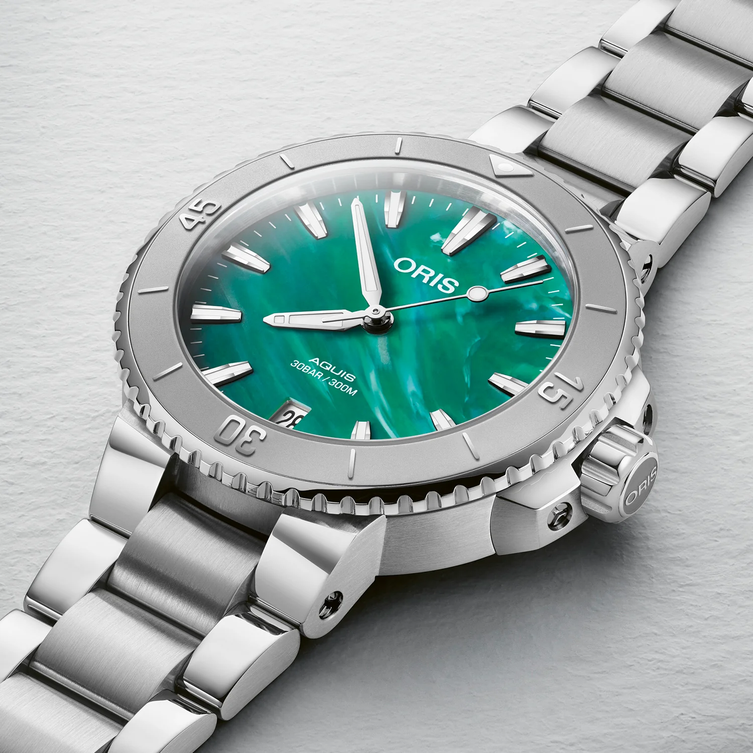 The 36.50mm stainless steel version, equipped with an automatic Oris 733 movement, is water-resistant up to 300m. Its case features a sapphire crystal with anti-reflective coating, a stainless steel case back with special engravings, and a screw-in security crown. The green dial, illuminated by Superluminova BG W9 on indices and hands, complements the multi-piece stainless steel bracelet with a security folding clasp.